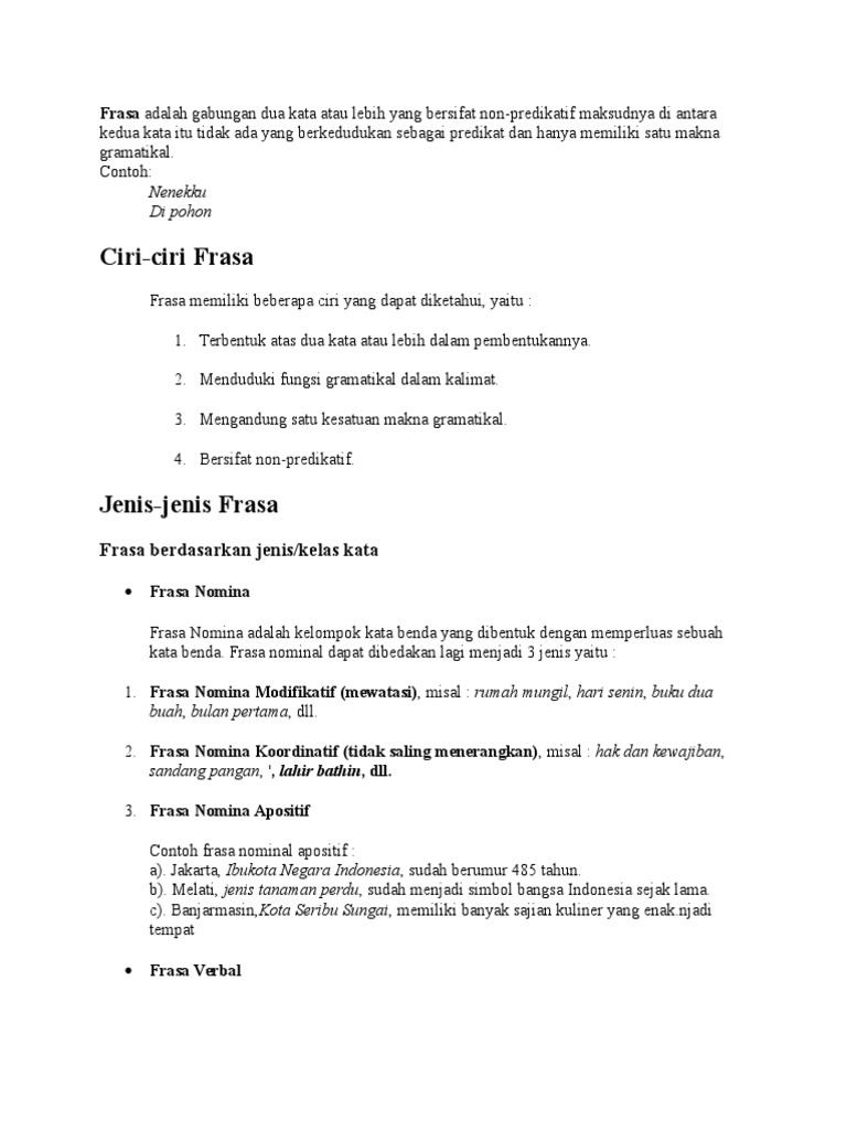 Contoh Kata Frasa Contoh Soal Dan Materi Pelajaran 7 from imgv2-1-f.scribdassets.com Frasa nomina koordinatif (tak saling menerangkan), contoh. Contoh frasa nomina koordinatif dalam kalimat.frasa nomina koordinatif merupakan kelompok kata benda yang memiliki kedudukan setara sebaga. Tanaman kacang itu akan tumbuh subur apabila petaninya rajin menyiram dan memberi pupuk. Bentuk logis yang dimaksudkan lyons (1996: Semua frasa dia atas termasuk ke dalam frasa nomina karena memiliki induk frasa. Lebih sederhannya, kasus dapat dikatakan bahwa nomina melakukan. Dalam kalimat yang predikatnya verba, nomina cenderung menduduki fungsi subjek, objek, atau pelengkap. Ibuku ialah seorang dosen di salah satu kampus swasta di kota ini.
